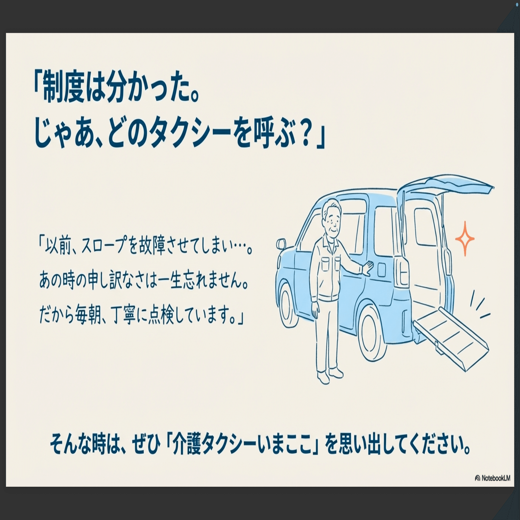 「制度があるのはわかったけど、どのタクシーを呼べばいいの?」 そんな時は、ぜひ「介護タクシーいまここ」を思い出してください