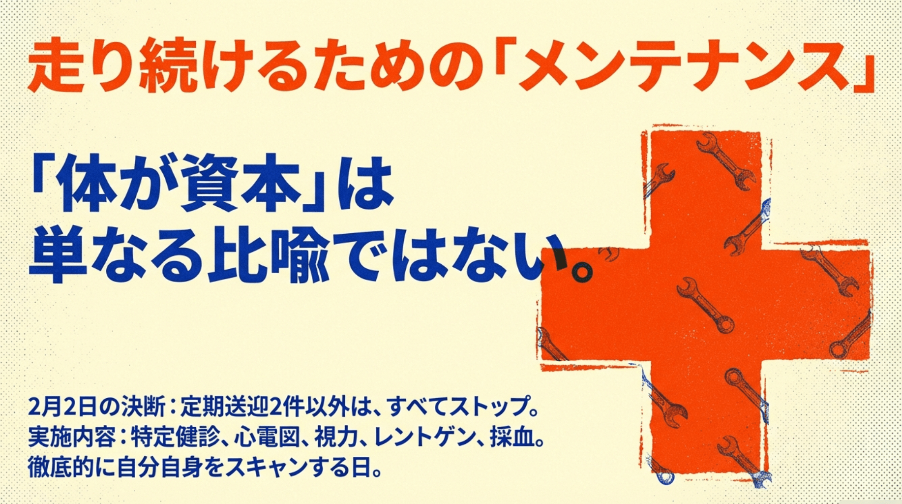 今日は、私たちが長く仕事をしていく上で欠かせない「2つのメンテナンス」についてお話しします。昨日の私の行動(人間ドックとAI事業の打ち合わせ)を通じて感じた、持続可能な働き方のヒントです。