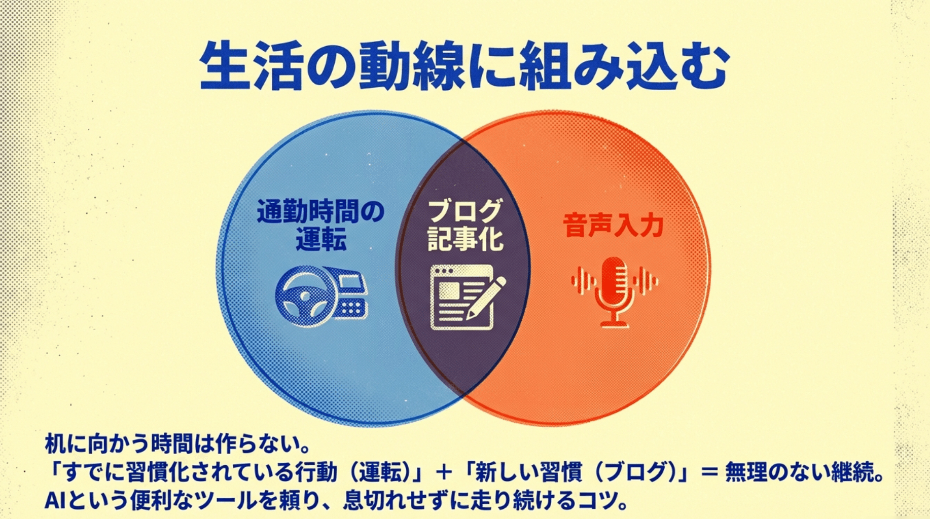 私が大切にしているのは、「生活の動線に組み込む」という考え方です。 わざわざ机に向かう時間を作るのではなく、毎朝必ず発生する「通勤時間の運転中」に、こうして独り言のように喋り、それをAIに記事化してもらう。
