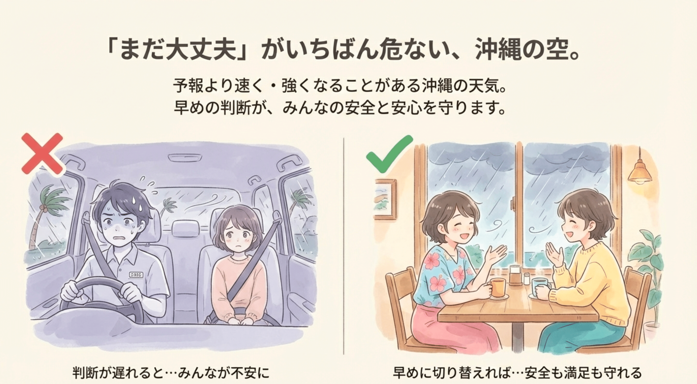 沖縄の雨風は“予報より速く・強く”来ることがあるので、先手で動くが勝ちです。