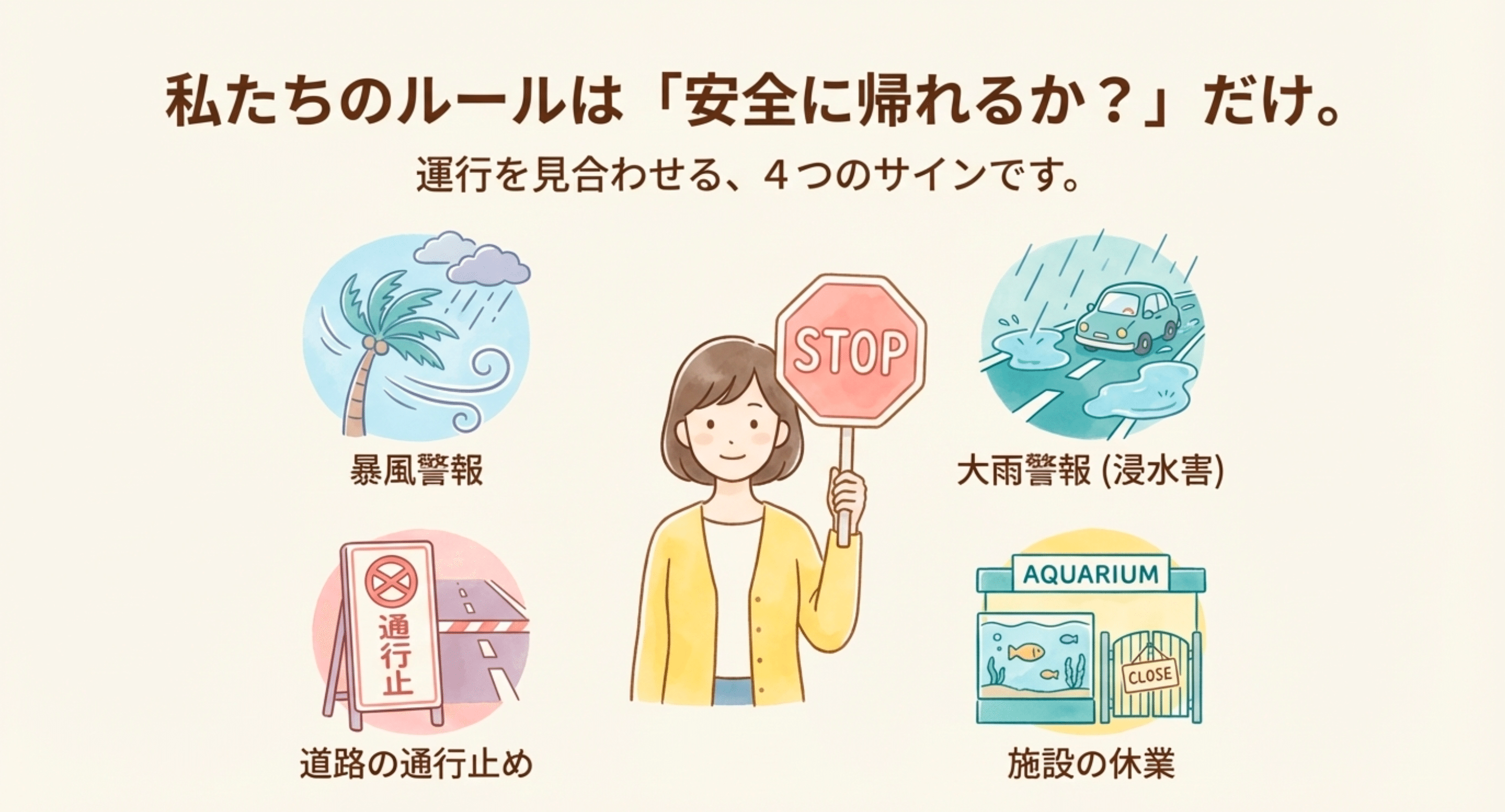 気象・交通・施設状況を確認し、運行継続か中止かを判断。早めに連絡します。 - 安全な場所へ誘導