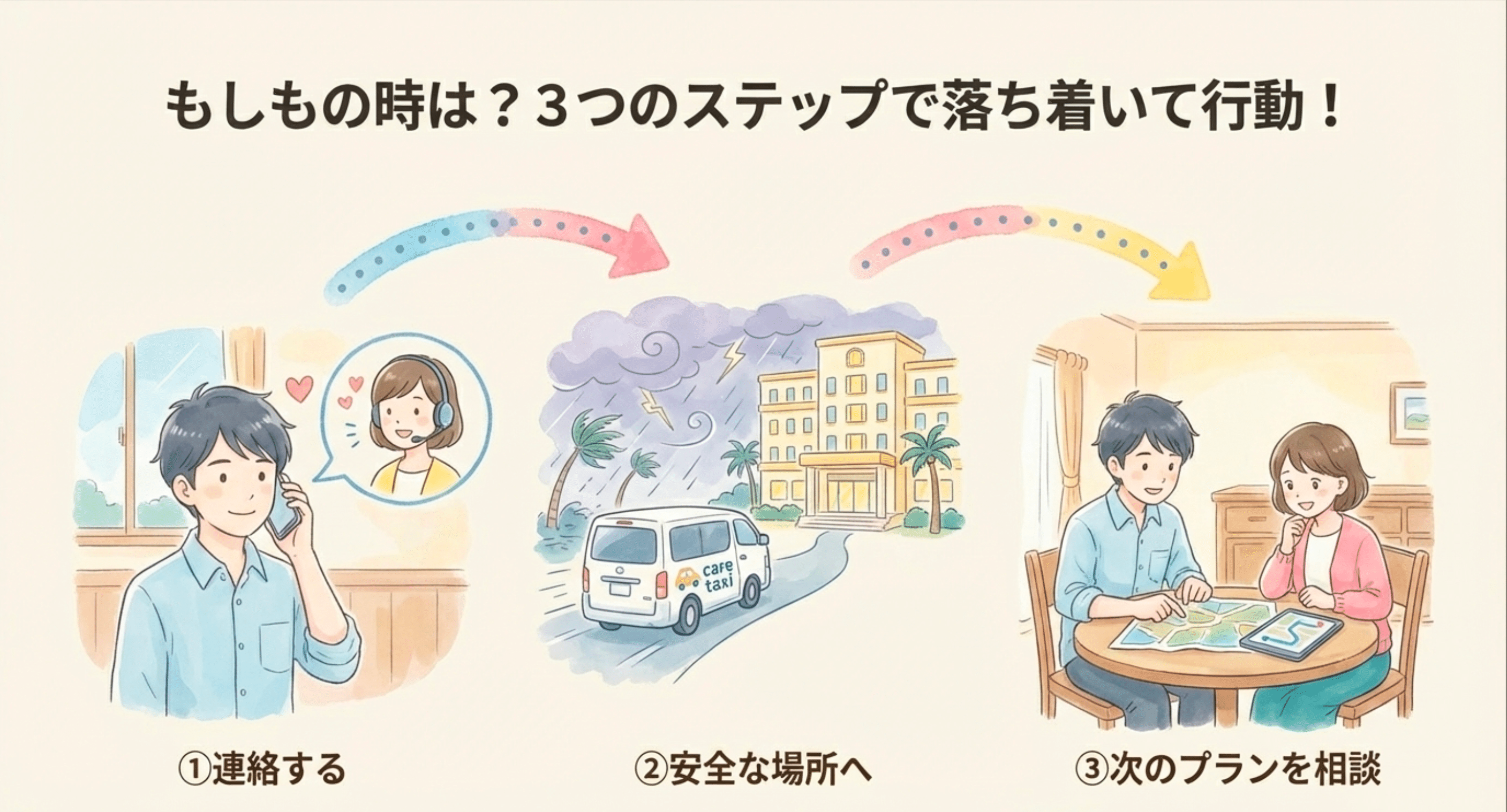 予定変更、宿泊先へ戻る、待機、別ルートなど、現実的な選択肢を一緒に組み立てます。