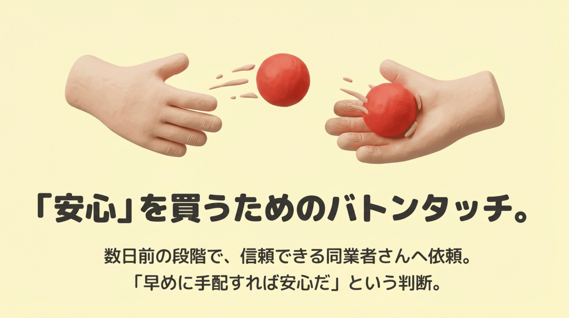 私たちはよく「早めの行動が大事」と教わります。 でも、流動的な現場においては、**「状況が確定するまで、選択肢(ボール)を自分で持ち続ける」**という胆力も必要なのだと痛感しました。