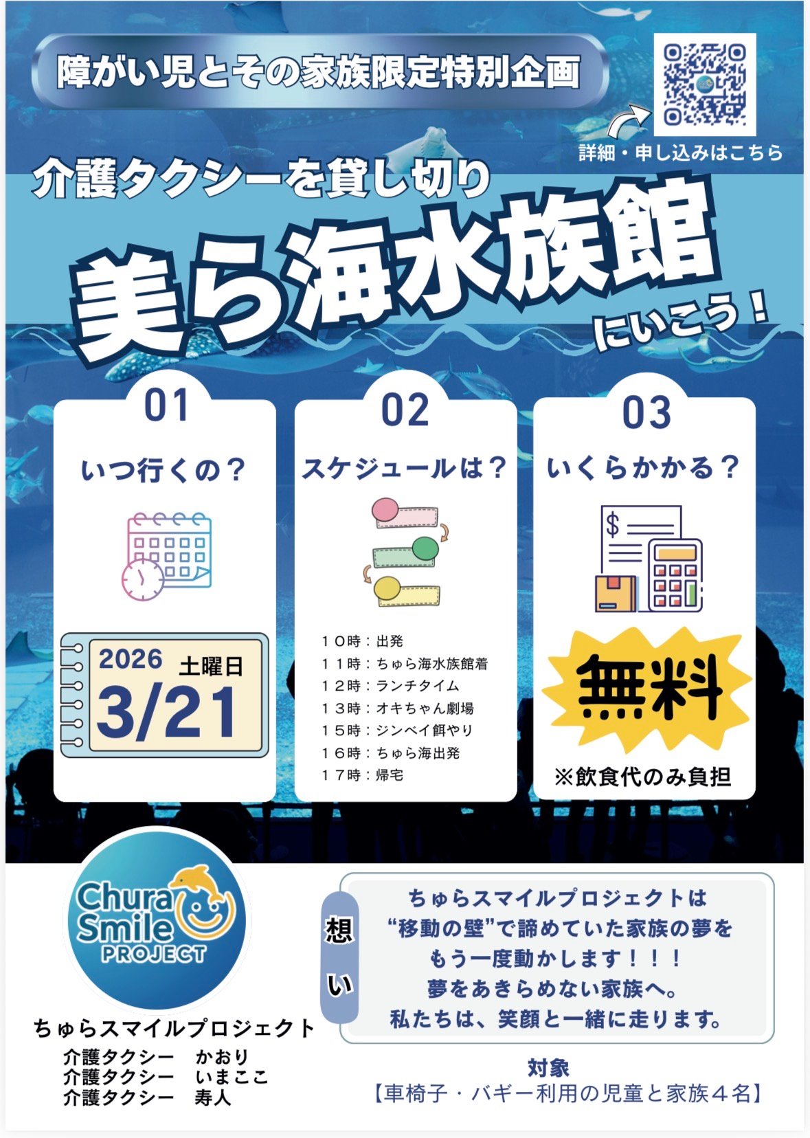 テーマは「ちゅらスマイルプロジェクト」が提供する、介護タクシー完全貸し切りの美ら海水族館ツアーです 。
