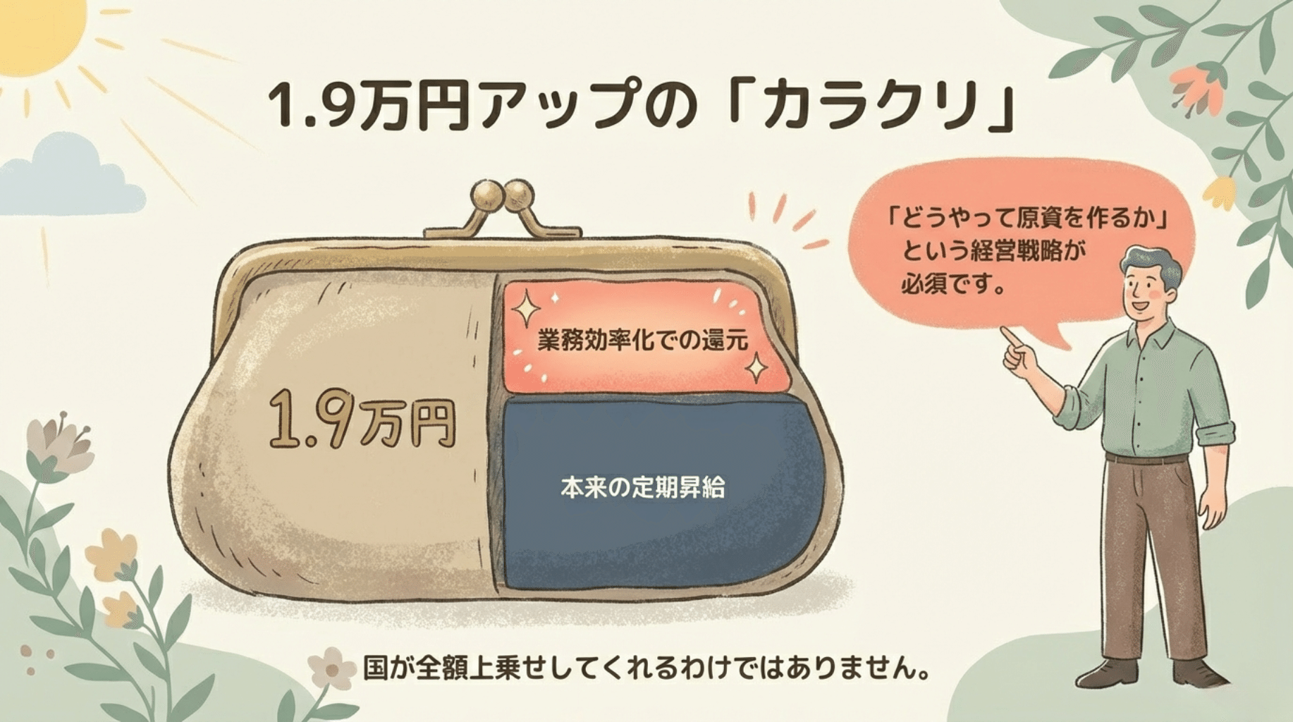 実はこの数字、以下の要素が「込み込み」で計算されています。 ① 本来の定期昇給分 ② 業務効率化で浮いた収益の還元分
