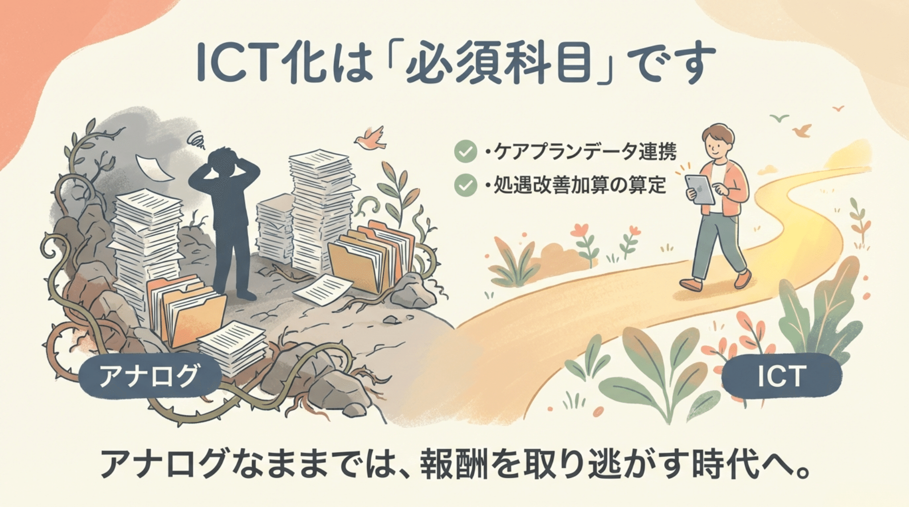 今回の改定は単なる「ご褒美」ではなく、ICT活用と経営の効率化を迫る「業界への挑戦状」です。