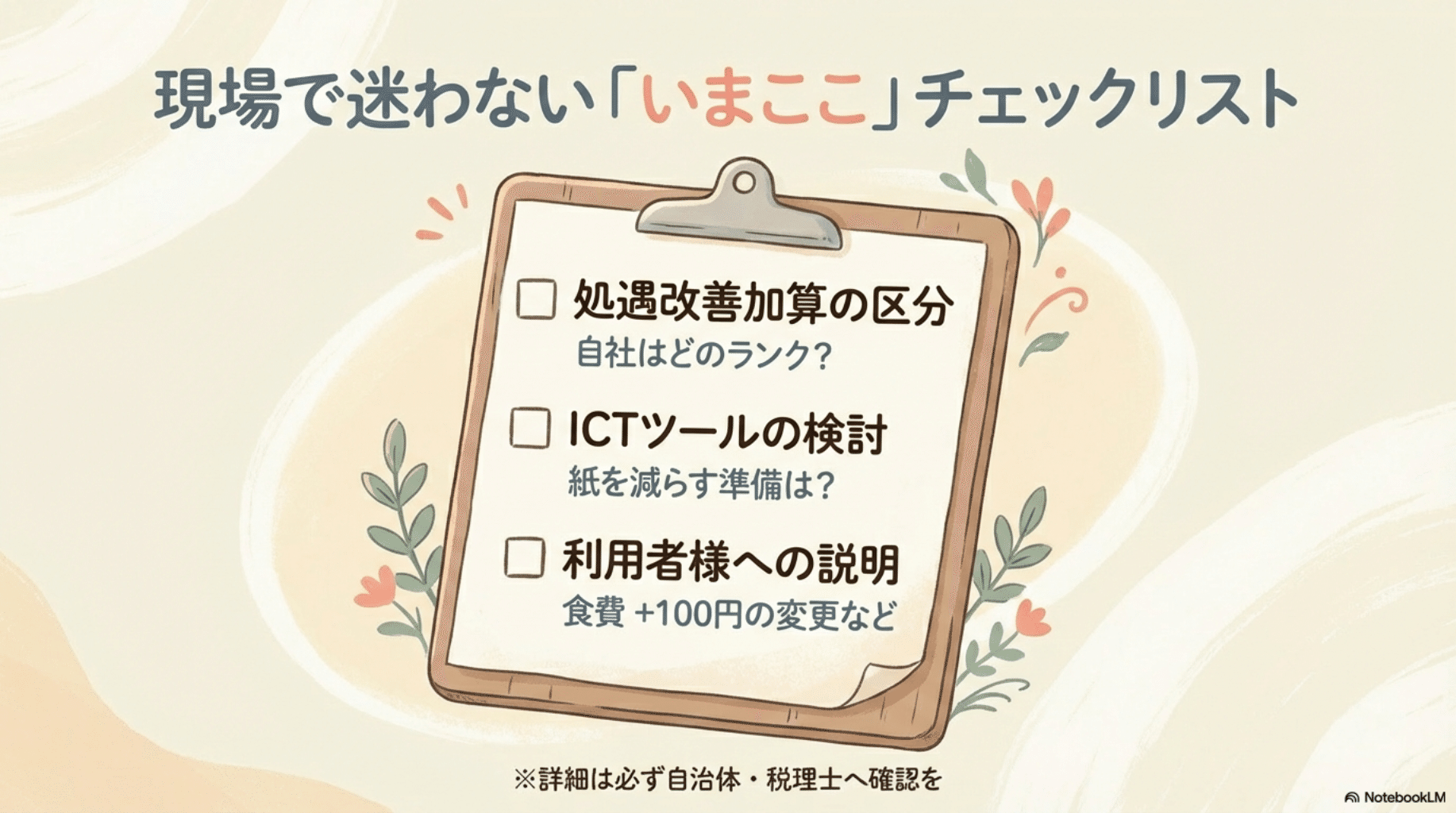 • [ ] 処遇改善加算の区分:自社がどのランクを目指せるか把握しているか?