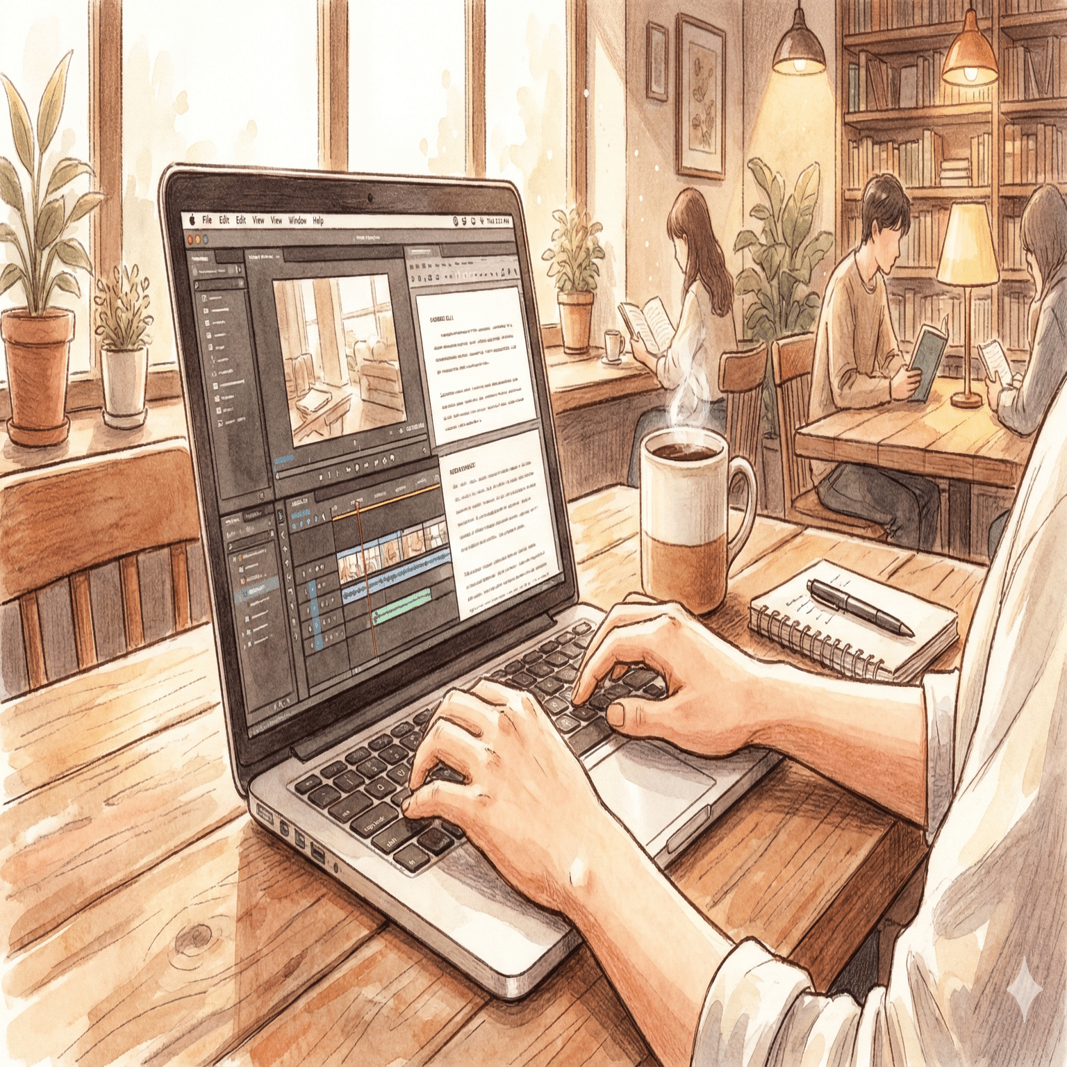 さて、車を預けている間、僕はただボーッとしていたわけではありません。 今日はここぞとばかりに、現在進行中の**「AIプロジェクト」**の資料作成や、クライアントワークの動画編集を進めていました。